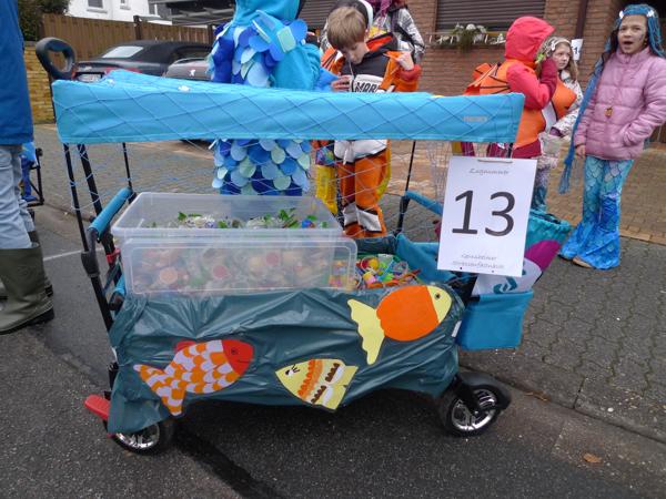 Da ein Umzug ohne Auswurfmaterial sehr langweilig war, wurde im Vorfeld fleißig gesammelt. Dank einiger Privatspenden und der Unterstützung des Fördervereins der Peter-Schöffer-Schule war unser Bollerwagen gut gefüllt mit Süßem und diversen maritimen Spielzeugen.