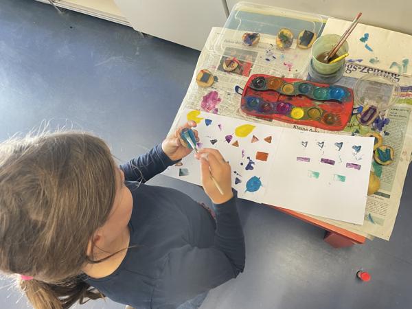 In einigen Klassen wurden unterschiedliche Druckmaterialien ausgetestet. Neben dem klassischen Kartoffeldruck gab es auch Drucken mit Nudeln, mit Legosteinen, mit Buchstabenstempeln, mit Moosgummiplatten und mit verschiedenen Farben und Papieren.