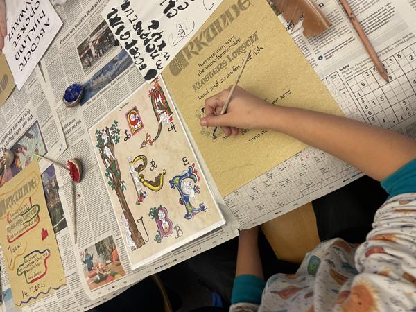 Das Schreiben kunstvoller Buchstaben und das Erstellen von handgeschriebenen Urkunden und Briefen war in der Projektwoche sehr beliebt. Trotz der mühevollen Handarbeit waren aber alle Kinder sehr fasziniert von den kunstvoll gestalteten Buchstaben und voller Stolz über die fertigen Urkunden und Briefe.