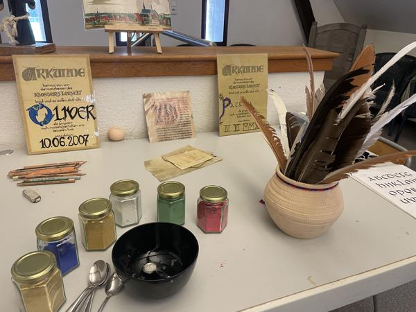 Einige Klassen besuchten das Kloster Lorsch und namen dort am Workshop "Oh, wie schwer ist das Schreiben!" teil. Nach einer fachlichen Einführung in die Arbeitsmaterialien konnte es losgehen. Es wurden Farben frisch angemischt und mit Tusche geschrieben. So entstanden mit viel Geduld und handwerklichem Geschick handgeschriebene Urkunden.