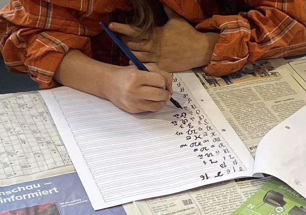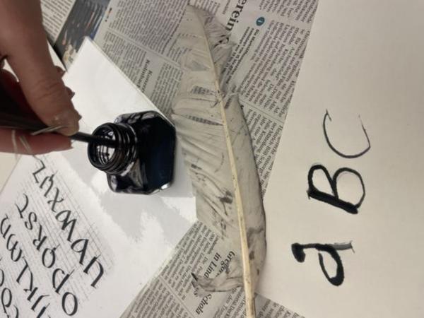Andere Klassen haben das Schreiben mit Feder und Tusche ausprobiert. Wem das Schreiben in Schönschrift und mit Tusche noch nicht ausgelastet hat, der durfte sich auch im Schreiben von gotischen Schriften und Sütterlin ausprobieren.