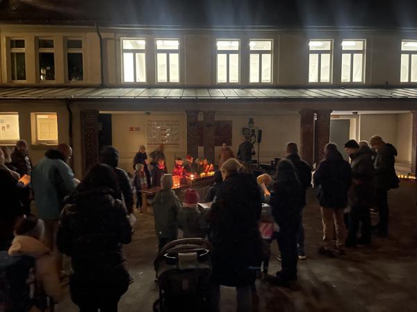 Nach dem Ankommen und Versammeln konnte es beiderorts um 7:10 Uhr losgehen. In der völligen Dunkelheit standen alle beisammen, erfreuten sich an den leuchtenden Lichtertüten, dem Adventskranz und der festlichen Dekoration. Es wurde gemeinsam gesungen und einige Kinder sprachen gemeinsam eine Fürbitte.