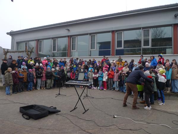 Um 18:00 Uhr füllte sich der Schulhof rasant. Es kamen so viele Besucher, dass es schwierig war, alle Auftrittskinder zu finden und zu versammeln. Das Programm für die Besucher war auch in diesem Jahr wieder sehr vielfältig: Nach der Begrüßung der Anwesenden unsere Schulleiterin Frau Günther, sangen alle Besucher gemeinsam "Kling Glöckchen". Es folgt der Auftritt der Chor-AG. Unter der Leitung von Frau Scholz sangen und tanzten die Kinder gleich zwei weihnachtliche Lieder. Weiter ging es mit der Klasse 1/2d, welche auswendig das lange Gedicht "Die Weihnachtsmaus" darbot. Danach wurde es wieder musikalisch mit den Englischklassen von Frau Günther und Herrn Marpe. Mit dem englischen, traditionellem Lied "I hear them" zeigten alle, wie gut sie bereits englisch singen können. Es folgte die Musikklassen von Herrn Wehrum, welche das Lied "In der Weihnachtsbäckerei" mit einem Body-Percussion-Rhythmus unterlegt darboten. Der Rhythmus war so mitreißend, dass viele Besucher gleich mitmachten. Zum Abschluss sangen alle noch die deutsche Version von "Merry Christmas, everyone".