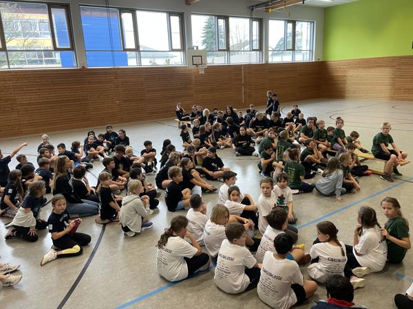 Mit fünf Klassen in der Turnhalle, verteilt auf Bühne und Geräteraum, war die Stimmung in der Halle bestens. Nach der Begrüßung aller und einer kurzen Wiederholung der dem Spiel zugrundeliegenden Regeln, konnte es losgehen.